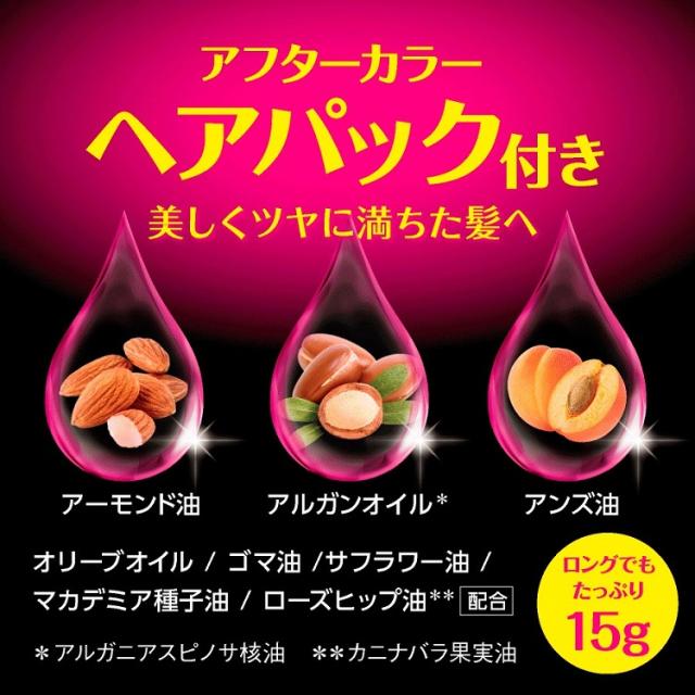 ●アーモンド油、アルガンオイル*、アンズ油をはじめ、8種のプレシャスオイル(うるおい成分)を配合したアフターカラーヘアパック付き *アルガニアスピノサ核油