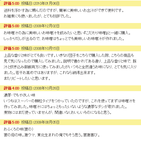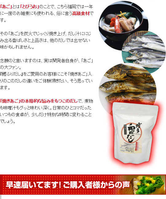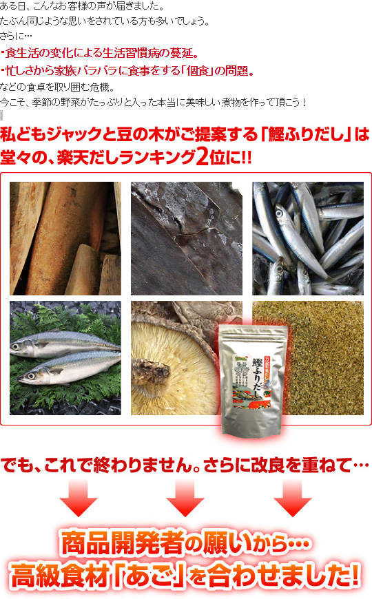 原材料::鰹節、鯖節、うるめ鰯節、昆布、椎茸粉末、焼きあご節、食塩、砂糖、粉末醤油、調味料(アミノ酸等)、L型乳酸カルシウム(完熟したサトウ大根を天然発酵させて作ったカルシウム)