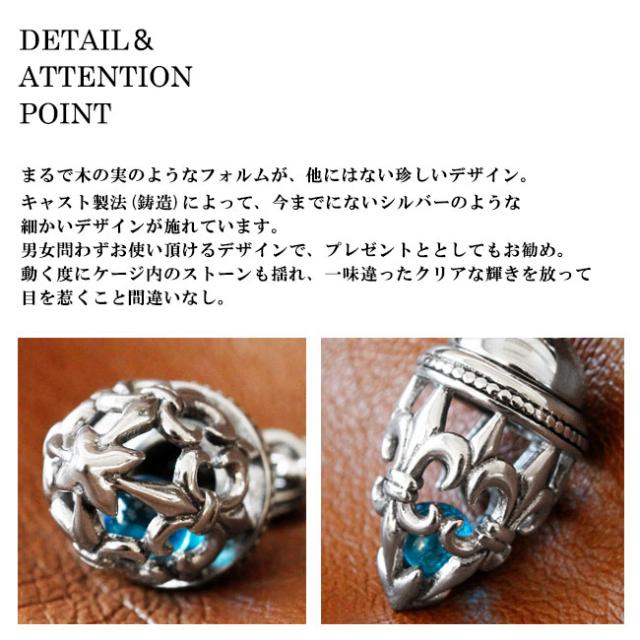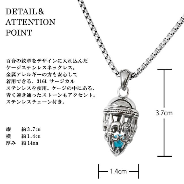 百合の紋章モチーフを使ったケージ型のステンレスネックレスです。立体的で継ぎ目のない美しい造形になっており、中には淡いブルーカラーのガラス玉が入っています。金属アレルギーの方にも安心して着用ができる316Lサージカルステンレスを使用しています。シンプルなデザインの多いステンレスアクセサリーですが、キャスト(鋳造)を施すことでシルバーアクセのような洗練されたデザインを実現しました。