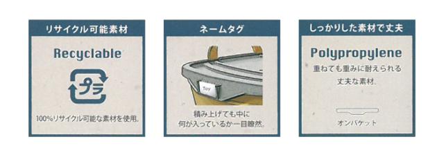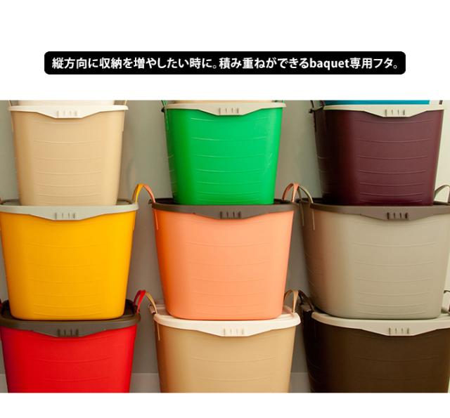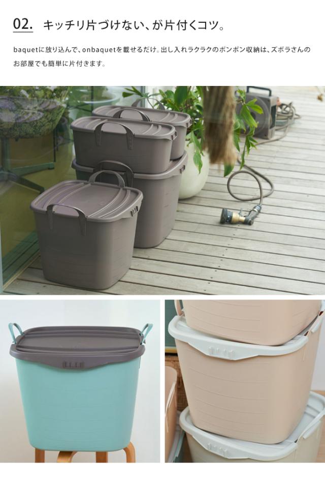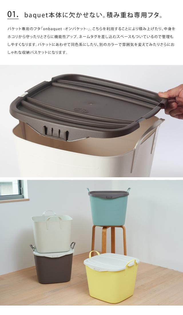 バケット専用のフタ「onbaquet -オンバケット-」を利用することにより積み上げたり、中身をホコリから守ったりとさらに機能性アップ。ネームタグを差し込むスペースもついているので管理もしやすくなります。バケットと同色系にしたり、別のカラーでさらにおしゃれに。