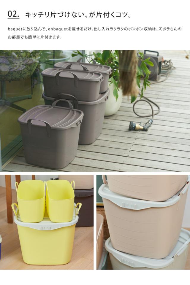 バケット専用のフタ「onbaquet -オンバケット-」。こちらを利用することにより積み上げたり、中身をホコリから守ったりとさらに機能性アップ。ネームタグを差し込むスペースもついているので管理もしやすくなります。バケットにあわせて同色系にしたり、別のカラーで雰囲気を変えてみたりさらにおしゃれな収納バスケットになります。baquetに放り込んで、onbaquetを載せるだけ。出し入れラクラクのポンポン収納は、ズボラさんのお部屋でも簡単に片付きます。