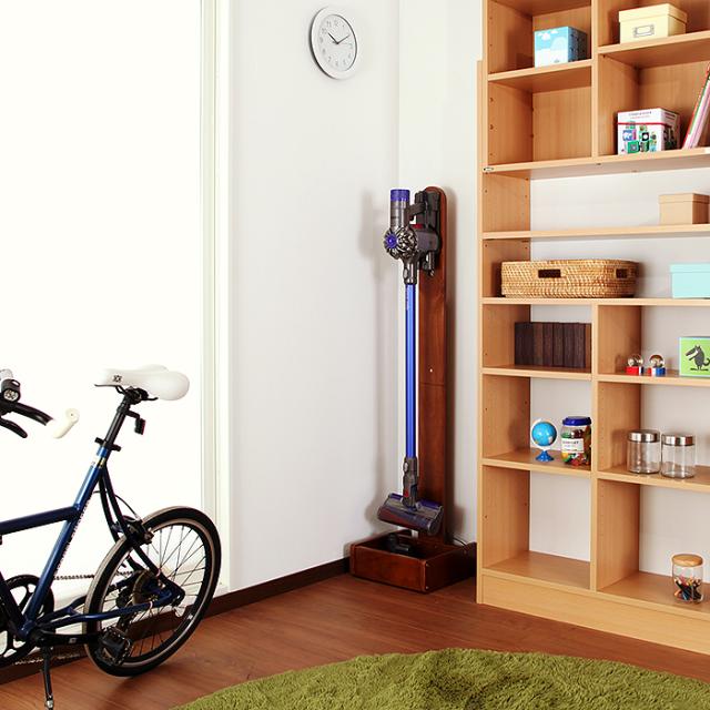 そんな悩みを解消する「天然木スティッククリーナースタンド」は、スティッククリーナーをスリムに収納でき、壁に穴を開けない為、どこにでも設置する事ができます。