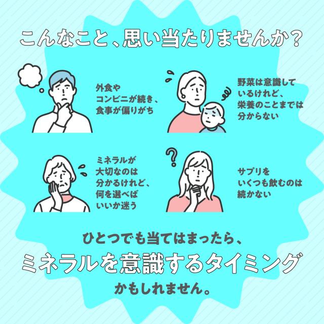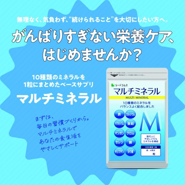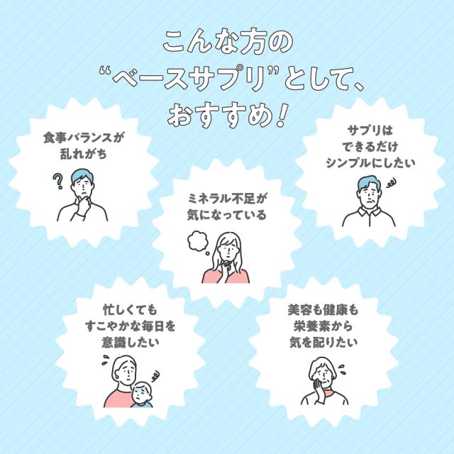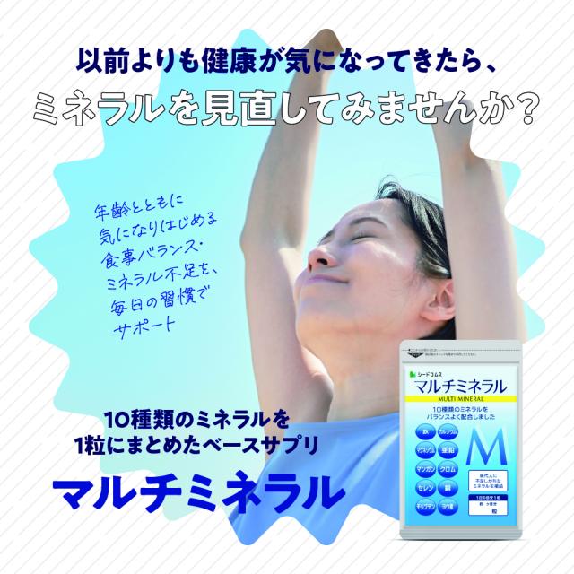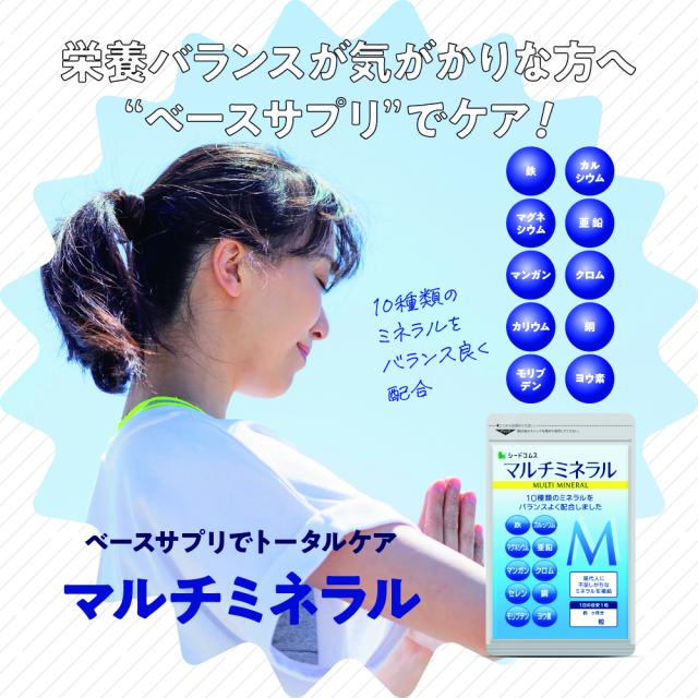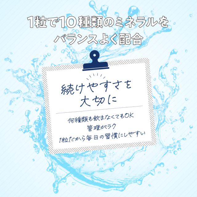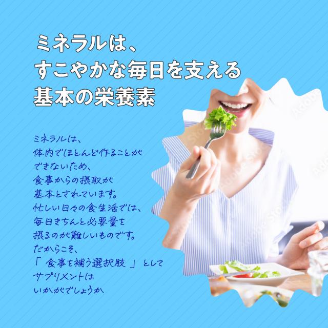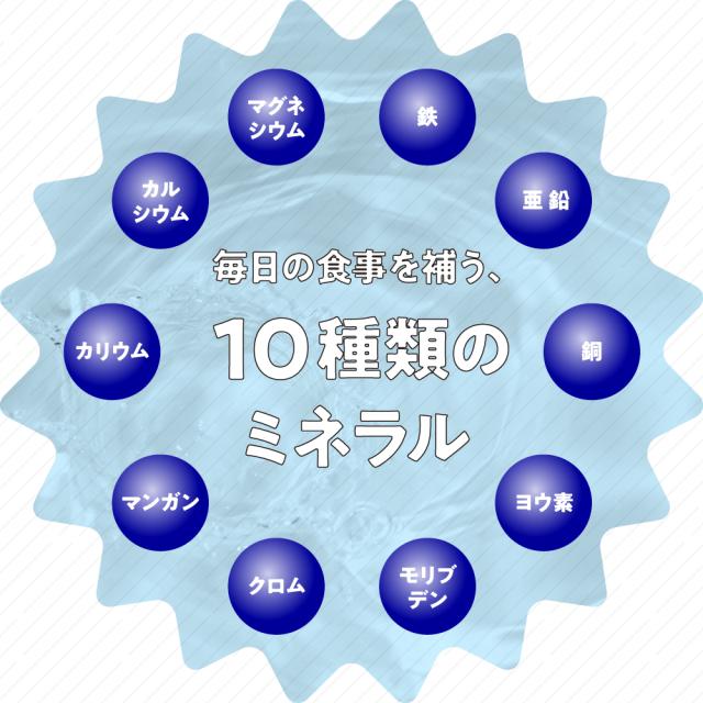 亜鉛・鉄・マンガン・クロム・ヨウ素・カルシウム・銅・セレン・鉄・モリブデン、10種類のミネラルをバランスよく配合!毎日の食事では補え切れない分はサプリで手軽に補給1