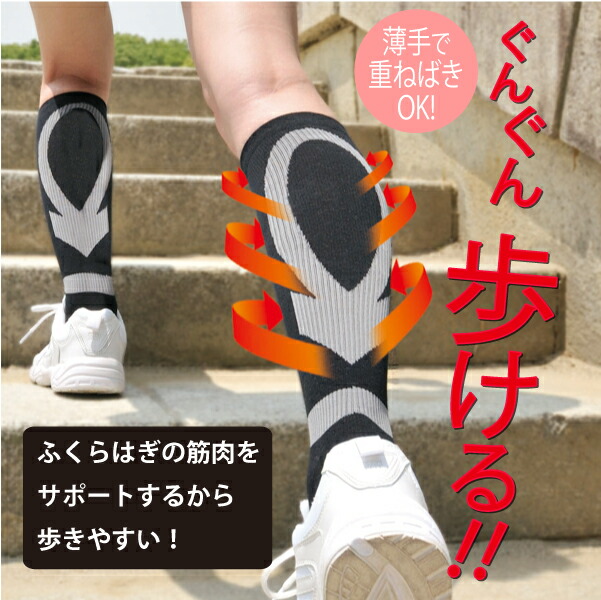 ☆足首から膝に向かって段階的に開放される着圧効果により、歩くたびにふくらはぎを揉み上げ、血流を良くして脚のつりを予防して疲れ、むくみを緩和します