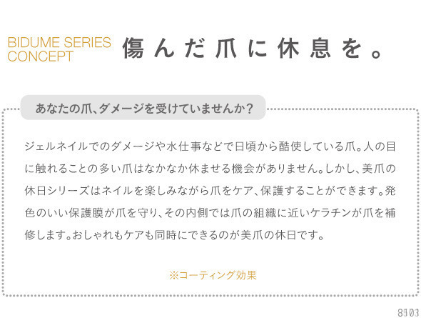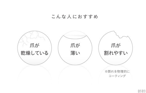 爪の成分に近しい美容成分を配合し、ダメージがあったり、老けた爪を潤い補修しながら、見た目にも美しい爪に仕上げます(コーティング効果)。