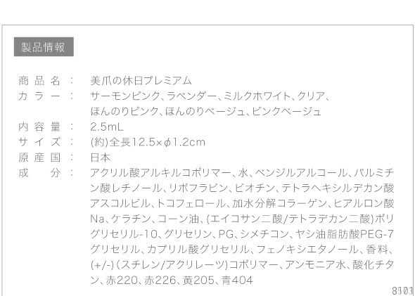 ■素材/アクリル酸アルキルコポリマー、水、ベンジルアルコール、パルミチン酸レチノール、リボフラビン、ビオチン、テトラへキシルデカン酸アスコルビル、トコフェロール、加水分解コラーゲン、ヒアルロン酸Na、ケラチン、コーン油、(エイコサン二酸/テトラデカン二酸)ポリグリセリル-10、グリセリン、PG、シメチコン、ヤシ油脂肪酸PEG-7グリセリル、カプリル酸グリセリル、フェノキシエタノール、香料、(+/-)(スチレン/アクリレーツ)コポリマー、アンモニア水、酸化チタン、赤220、赤226、黄205、青404