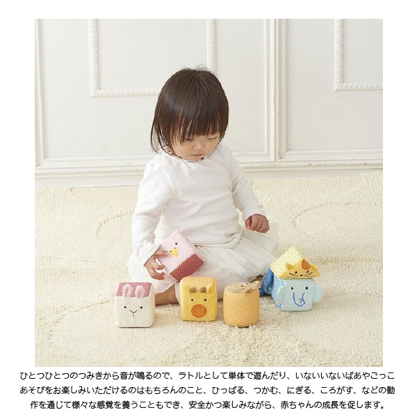 ひとつひとつのつみきから音が鳴るので、ラトルとして単体で遊んだり、いないいないばあやごっこあそびをお楽しみいただけるのはもちろんのこと、ひっぱる、つかむ、にぎる、ころがす、などの動作を通じて様々な感覚を養うこともでき、安全かつ楽しみながら、赤ちゃんの成長を促します。