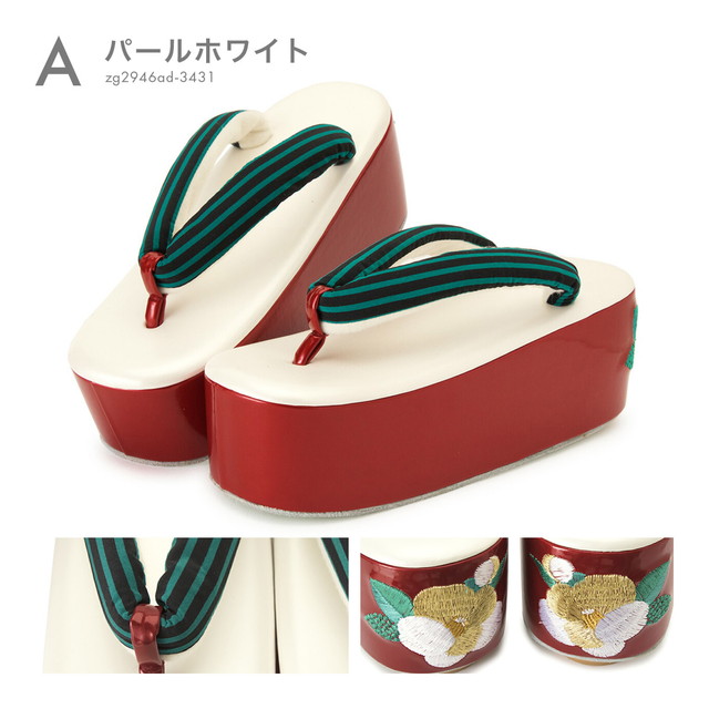 ふんわりとした太めで粋なストライプ柄の鼻緒が挿げられ、巻きの踵部分に刺繍で椿の花が施された華やかなデザインです。