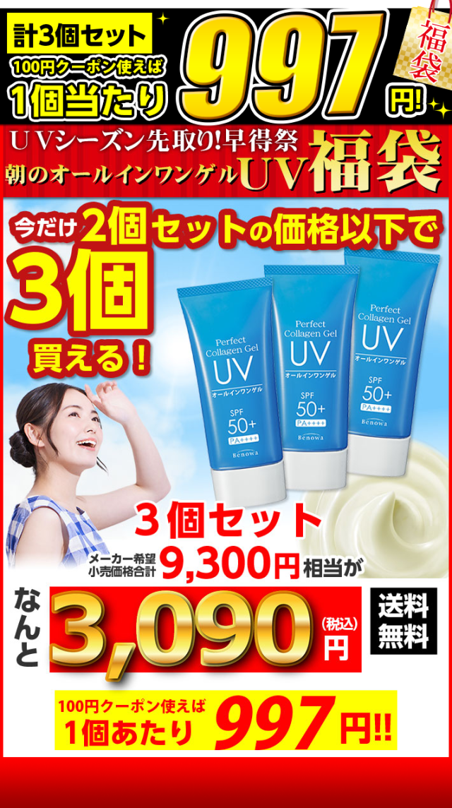 3個セット ビノワ パーフェクトコラーゲンゲルUV SPF50+ WA50708 送料無料 ネコポス 3p ai1 コスメ オールインワン SALE 三太郎の日 UVケア シミ しわ たるみ コスメ uvwh zaiko ts