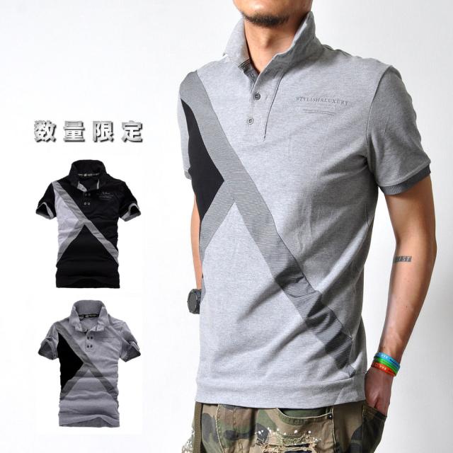 期間限定 SALE【ラスト1】半袖 ポロシャツ メンズ #TPpk02 アシンメトリ ライン切り替え トップス 大きいサイズ M便 BL