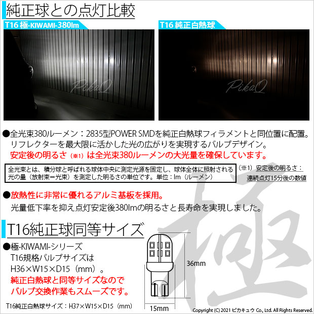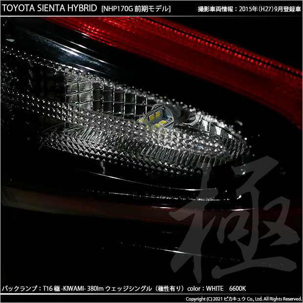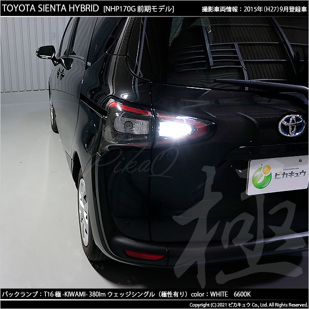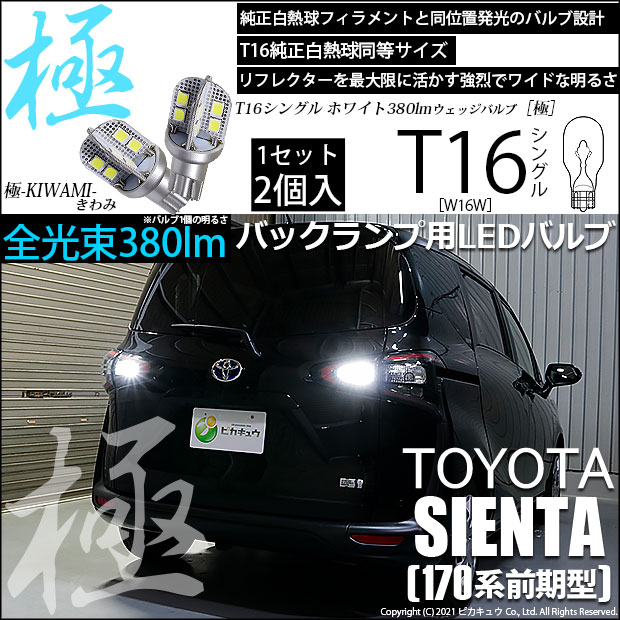 ピカキュウ,LED専門店,LEDバルブ,国産DC12V車,LED,SMD,T16シングル,W16W,バックランプ,ホワイト,全光束380lm,ハイブリッド車対応,極,KIWAMI,きわみ,トヨタ,2代目シエンタ,シエンタ,TOYOTA,SIENTA HYBRID,NHP170,前期