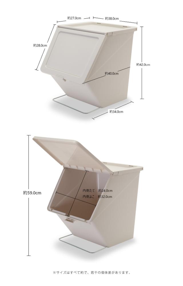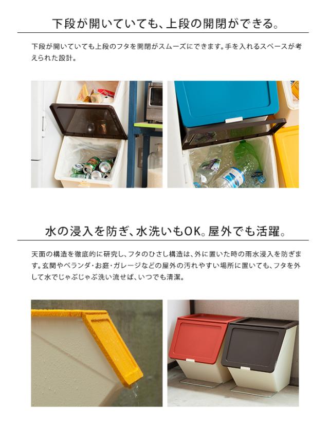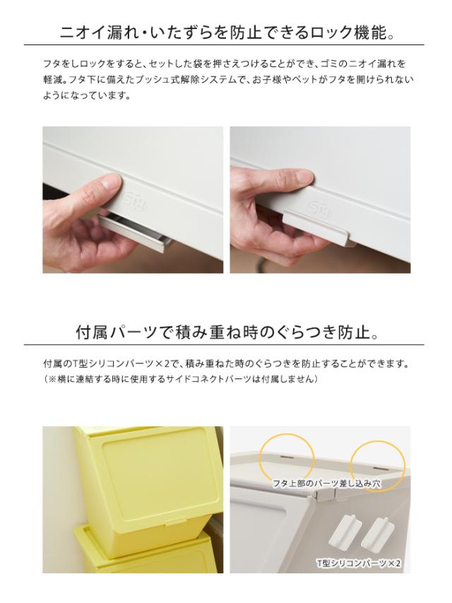 大きな開口部は袋の取り付けやゴミの取り出しもスムーズに。フタが止まるので手で支える必要が無く、片手でスムーズにゴミ捨てや物の出し入れができます。開いて止まるとき、下ろして閉じるとき、物音をたてないようにしっかりとした静音設計。重ねて使う時に安心な付属のサポートプロップを底に取り付ければ、前への転倒防止に。お子様のおもちゃ箱・おむつ入れとして、野菜や食品のストックなどを入れるフードストッカーとしても安心な100%バージン素材を使用。リサイクル可能素材なので環境にも優しい。