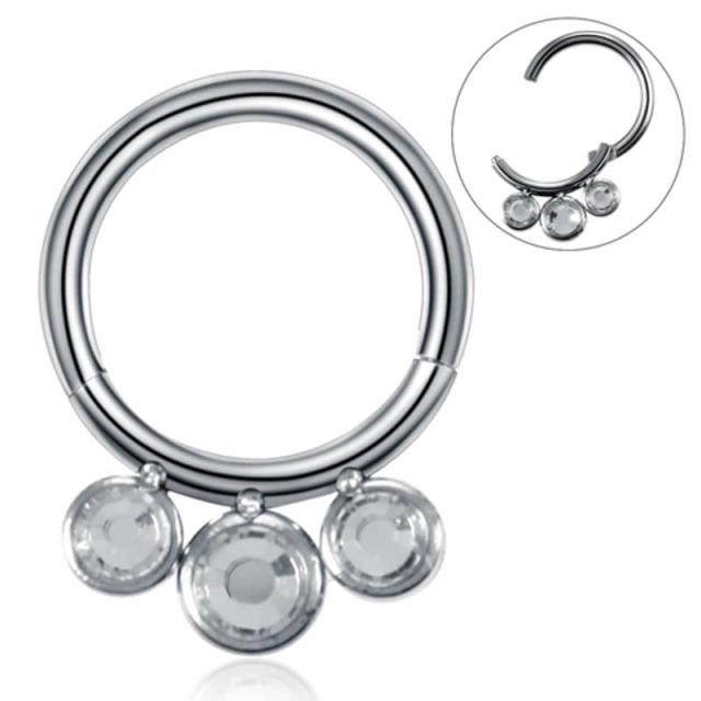 セグメントリングのような真円のリングにクリスタルを3つセットしたクリッカータイプのボディピアス。ワンタッチで開閉できるヒンジ(蝶番)付きのセグメントクリッカーは、装着も簡単でメンズでもレディースでも使えるボディーピアスです。軟骨ピアスのヘリックスやトラガス、耳たぶはもちろん、ルーク、ダイス、鼻ピアスやニップル、眉ピアスのアイブローなどいろいろな場所に使えるキャプティブリング(CBR/BCR)のようなボディピアス。プレゼントにも最適です。