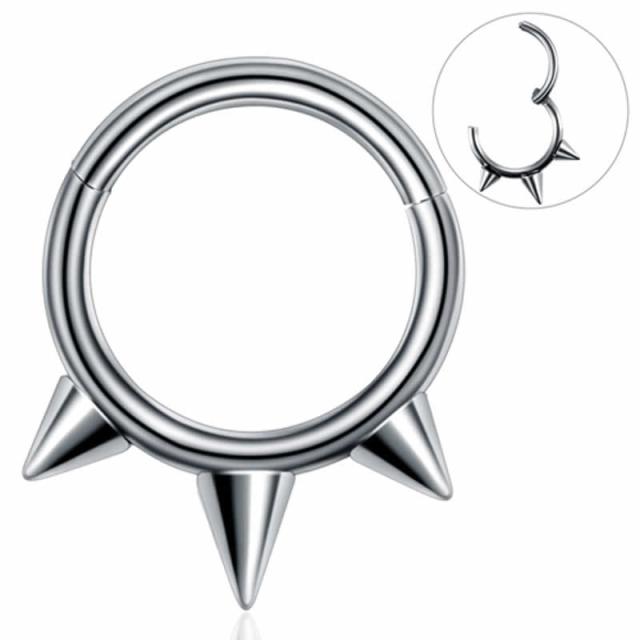 セグメントリングのような真円のリングにスパイクコーンを3つセットしたクリッカータイプのボディピアス。ワンタッチで開閉できるヒンジ(蝶番)付きのセグメントクリッカーは、装着も簡単でメンズでもレディースでも使えるボディーピアスです。軟骨ピアスのヘリックスやトラガス、耳たぶはもちろん、ロック、ダイス、鼻ピアスやニップル、眉ピアスのアイブローなどいろいろな場所に使えるキャプティブリング(CBR/BCR)のようなボディピアス。プレゼントにも最適です。