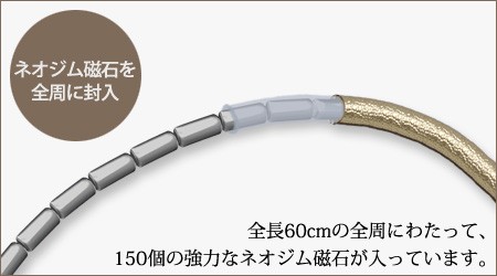レアアース磁石のひとつネオジム磁石は、世の中にある磁石の中で最も強力な磁石。同じサイズのフェライト磁石と比較しておよそ10倍もの磁力があります。この強力なネオジウム磁石をネックレス全周にわたり計150個も使用しました。 磁石の入っている場所を気にすることなく、簡単にコリの場所を磁力が直撃!効率よくコリをほぐし、血行の改善の効果が得られます。長時間のPCの操作などが続くお仕事、スマートフォンやなどで肩がこりやすい方にお使いいただきたい管理医療機器認可の磁気ネックレスです。