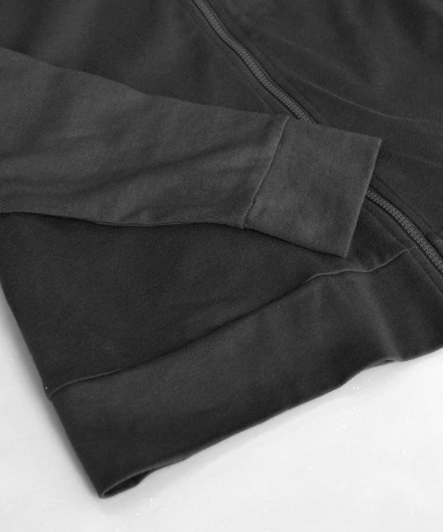 薄手の長袖シャツの上から着用し、着丈はお尻が半分隠れるくらい。袖丈は親指の付け根くらいの位置でした。ジッパーを全部閉めても身幅は余裕があり、ゆったりと着られます。