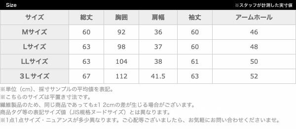 半袖Tシャツの上から着用しました。《M》 【着丈】 腰骨が隠れる 【袖丈】 手首が隠れる 【身幅】 やや小さめ 【胸周り】 やや小さめ 【アームホール】 やや小さめ 【肩幅】 やや小さめ 【首の開き】 ちょうどいい 《L》 【着丈】 腰骨がしっかり隠れる 【袖丈】 手首が隠れる 【身幅】 ちょうどいい 【胸周り】 ちょうどいい 【アームホール】 ちょうどいい 【肩幅】 ちょうどいい 【首の開き】 ちょうどいい 《LL》 【着丈】 腰骨がしっかり隠れる 【袖丈】 手首が隠れる 【身幅】 ちょうどいい 【胸周り】 ちょうどいい 【アームホール】 ややゆったり 【肩幅】 ちょうどいい 【首の開き】 ちょうどいい 《3L》 【着丈】 お尻の中間あたり 【袖丈】 親指の付け根あたり 【身幅】 ゆったり 【胸周り】 ゆったり 【アームホール】 ゆったり 【肩幅】 ゆったり 【首の開き】 ちょうどいい 私は全体的なバランスがいいLLサイズを選びます。 |