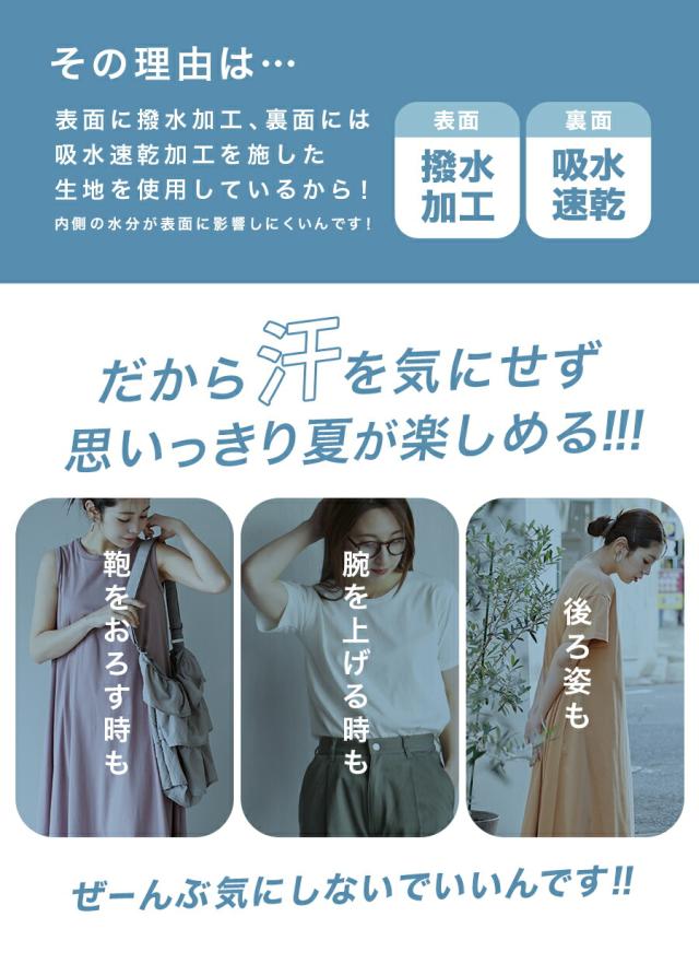 さらにUVカット加工も同時に搭載。汗を気にせず、日差しも気にせず、存分に夏のおしゃれをお楽しみください。