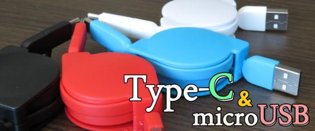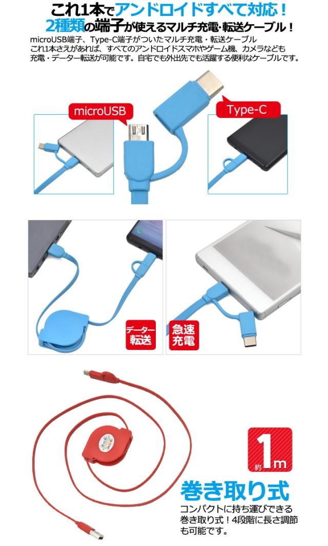 タイプC 便利な 2種対応 microUSB+Type-C マルチ充電 転送USBケーブル 2機種 スッキリ巻き取り式 メール便送料無料