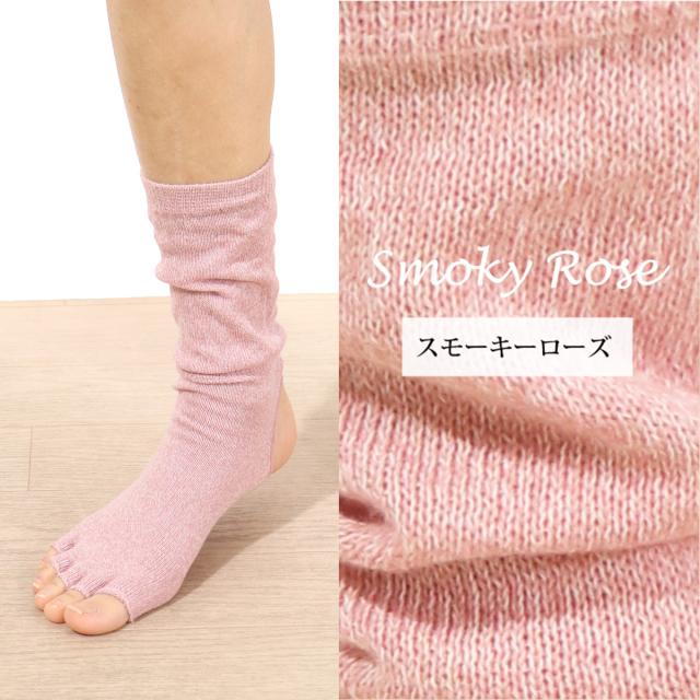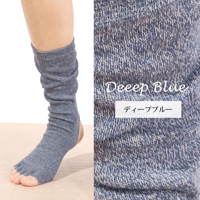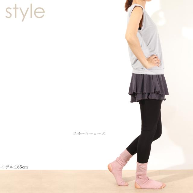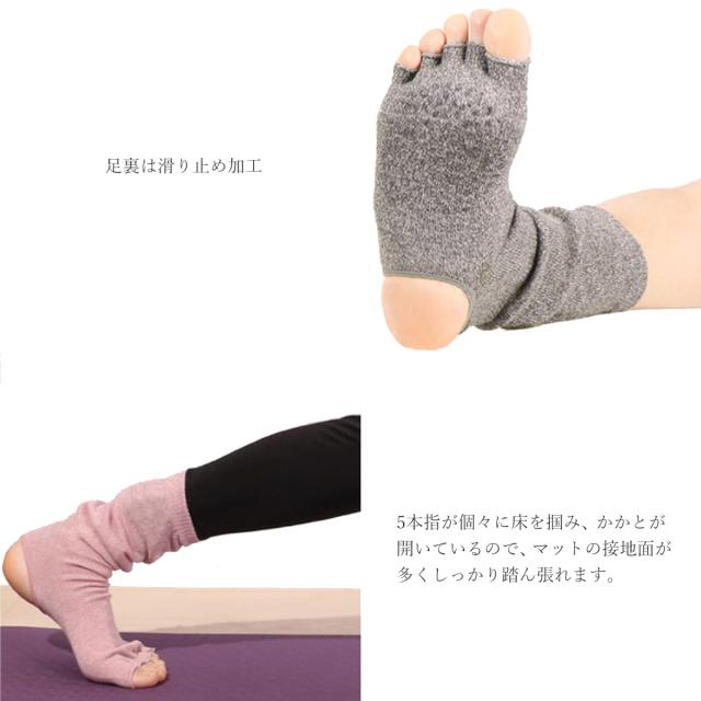 ヨガに最適なオープントゥの5本指ソックス。寒い季節や冷房の効いた部屋での冷え防止に欠かせないソックス。かかと部分がオープンになっていて、母子球の部分のに滑り止め加工を施しています。レギンススタイルにプラスしてキュートな着こなしを楽しんで頂けます。