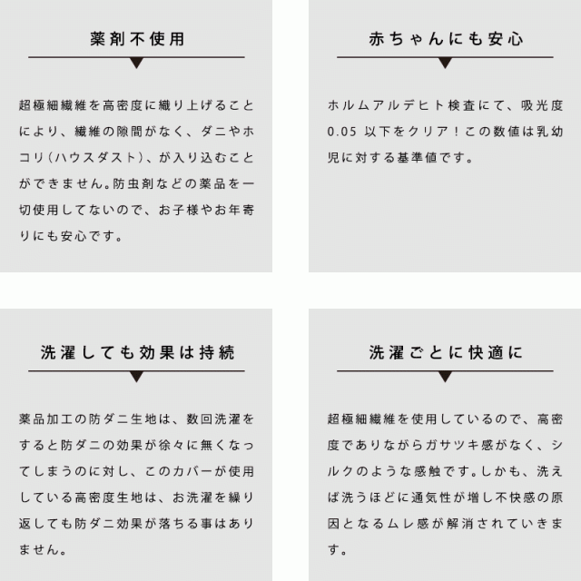 防虫剤は一切不使用の高密度生地! お布団は皮脂・髪の毛・汗からの老廃物が蓄積して、それを餌にするダニの温床になってしまうことも。アレルギーを持っていなくてもぞっとするのに、実際に悩んでいる方には本当に心配です。でもだからといって毎晩お肌に触れる寝具に薬剤を使うのも心配…。そんなあなたに知ってほしい高密度生地。