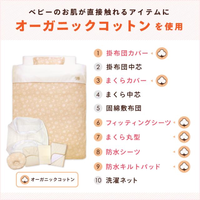 化学薬品不使用のオーガニックコットンダブルガーゼベビー布団10点セット。