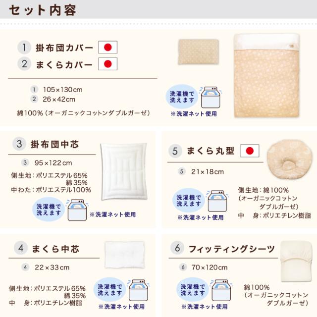 【1】掛布団カバー<105×130cm> ■日本製 綿100%(オーガニックコットンダブルガーゼ) 【2】掛布団中芯<95×122cm>(重量:約300g) ■中国製 側生地/ポリエステル65%・綿35% 中綿/ポリエステル100% 【3】枕カバー<26×42cm> ■日本製 綿100%(オーガニックコットンダブルガーゼ) 【4】枕中芯<22×33cm> ■中国製 側生地/ポリエステル65%・綿35% 中身/ポリエチレン樹脂 【5】固綿敷布団<70×120cm(厚み6cm)> ■側生地:中国製 中綿:日本製 側生地・中綿/ポリエステル100% 【6】フィッティングシーツ<70×120cm> ■中国製 綿100%(オーガニックコットンダブルガーゼ) 【7】ベビー枕<21×18cm> ■日本製 側生地/綿100%(オーガニックコットンダブルガーゼ) 中身/ポリエチレン樹脂 【8】防水シーツ<70×120cm> ■中国製 綿100%(パイル部分)(オーガニックコットン) ポリエステル100%(地糸) (裏側にポリウレタンラミネート加工) 【9】防水キルトパッド<70×120cm> ■中国製 綿100%(パイル部分)(オーガニックコットン) ポリエステル100%(地糸) 中綿/ポリエステル100% (裏側にポリウレタンラミネート加工) 【10】洗濯ネット<直径40×高さ50cm> ■中国製 ポリエステル100% 内寸サイズが長さ120cm×幅70cmのベビーベッドに対応しています。 |