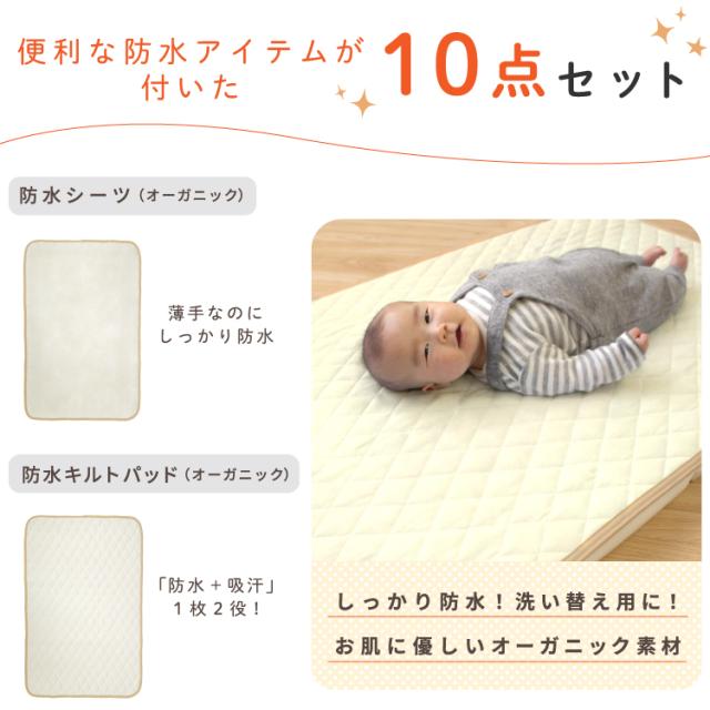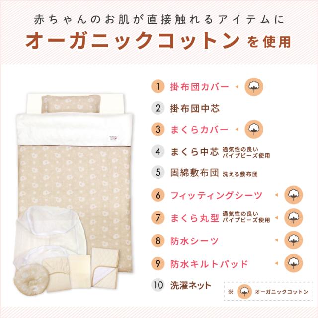 化学薬品不使用のオーガニックコットンを使用したミニベビー布団10点セット。