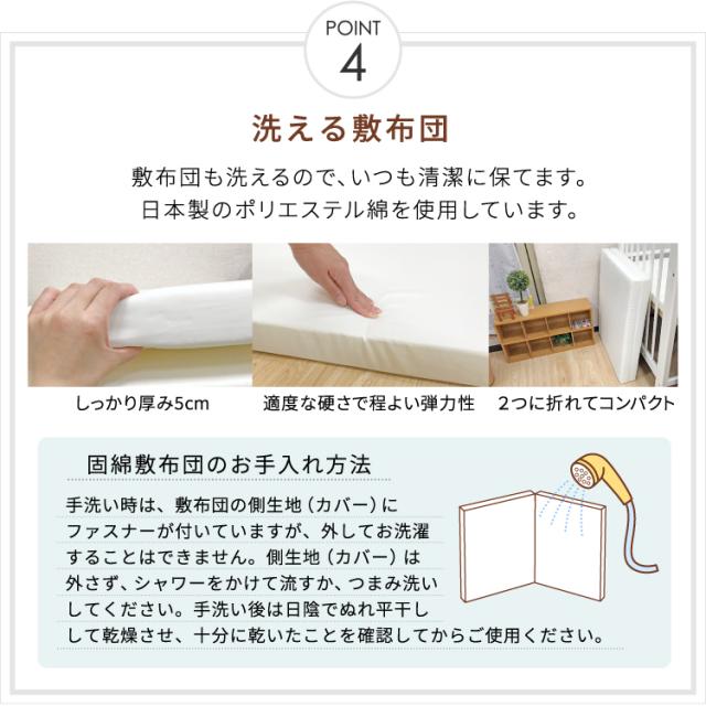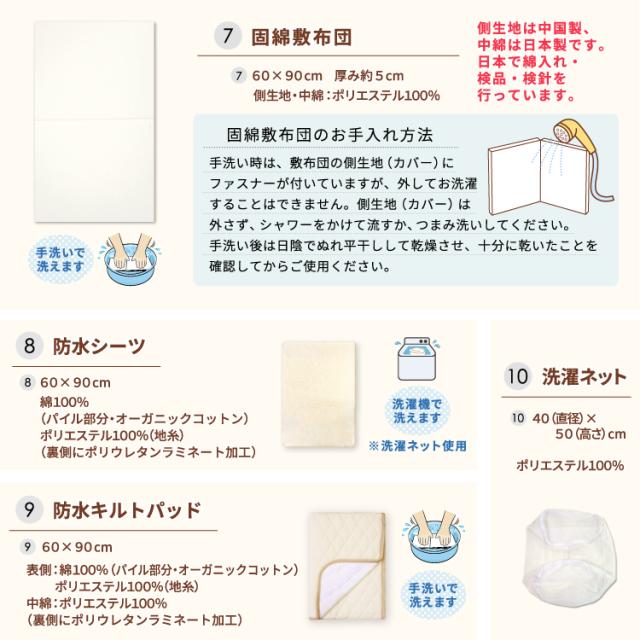 【1】ミニ掛布団カバー<サイズ:80×105cm> ■日本製 綿100%(オーガニックコットンダブルガーゼ) 【2】ミニ掛布団中芯<サイズ:76×100cm> ■中国製 側生地/ポリエステル65%・綿35% 中綿/ポリエステル100% 【3】枕カバー<サイズ:26×42cm> ■日本製 綿100%(オーガニックコットンダブルガーゼ) 【4】枕中芯<サイズ:22×33cm> ■中国製 側生地/ポリエステル65%・綿35% 中身/ポリエチレン樹脂 【5】ミニ固綿敷布団<サイズ:60×90cm(厚み約5cm)> ■側生地:中国製 中綿:日本製 側生地・中綿/ポリエステル100% 【6】ミニフィッティングシーツ<サイズ:60×90cm> ■日本製 綿100%(オーガニックコットンダブルガーゼ) 【7】ベビー枕<21×18cm> ■日本製 側生地/綿100%(オーガニックコットンダブルガーゼ) 中身/ポリエチレン樹脂 【8】ミニ防水シーツ<60×90cm> ■中国製 綿100%(パイル部分)(オーガニックコットン) ポリエステル100%(地糸) (裏側にポリウレタンラミネート加工) 【9】ミニ防水キルトパッド<60×90cm> ■中国製 綿100%(パイル部分)(オーガニックコットン) ポリエステル100%(地糸) 中綿/ポリエステル100% (裏側にポリウレタンラミネート加工) 【10】洗濯ネット<直径40×高さ50cm> ■中国製 ポリエステル100% 内寸サイズが長さ90cm×幅60cmのベビーベッドに対応しています。 |
