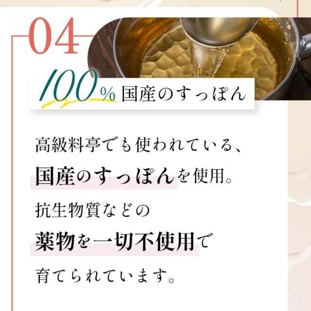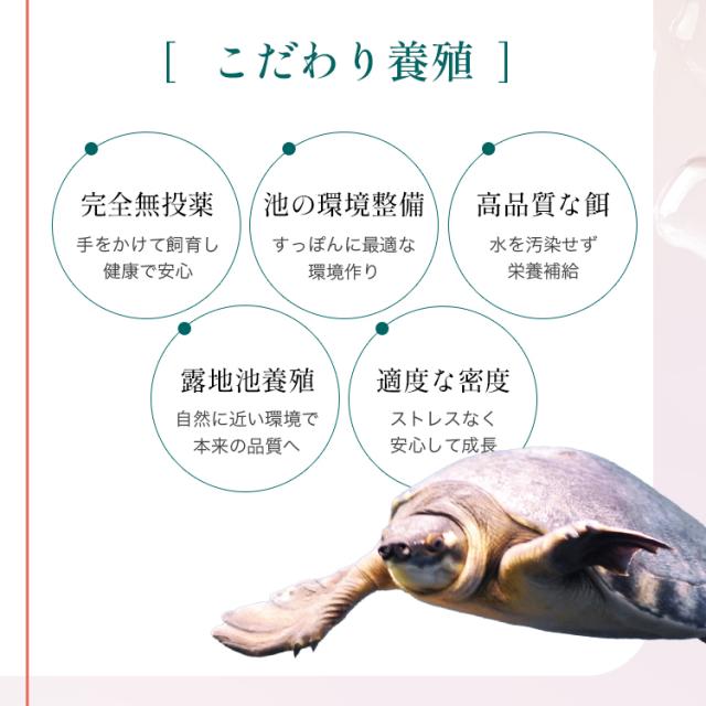 本品は、料理店に提供される高級品・国内産のスッポンを使用。抗生物質等薬物を一切使用せず飼育。