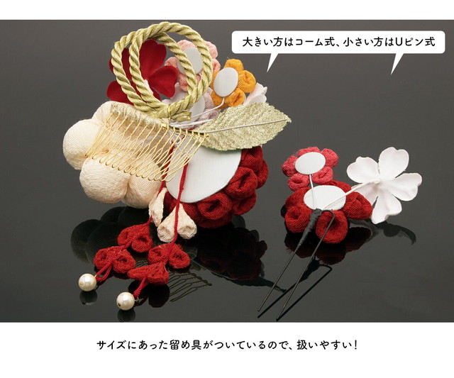 大きな髪飾りの留め具はコーム式、小さな髪飾りはUピン式です。