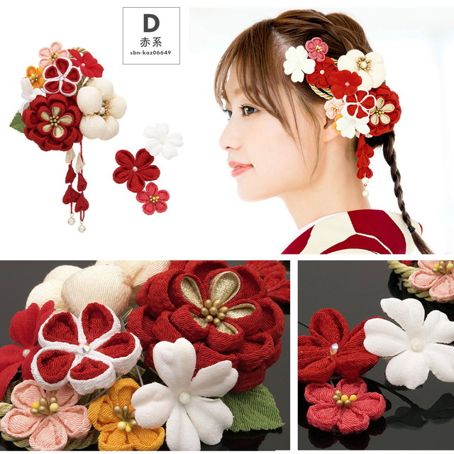 成人式 髪飾り 成人式の髪飾り 2点セット 赤 レッド アイボリー 梅 菊 花 縮緬 ちりめん 丸つまみ つまみ細工 藤下がり ぶら飾り コーム Uピン 髪留め 卒業式向け 振袖向け 袴向け ヘアアクセサリー 日本製 和装