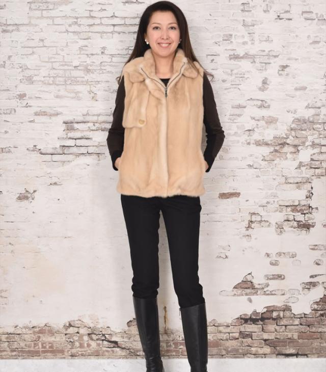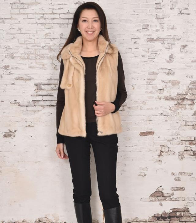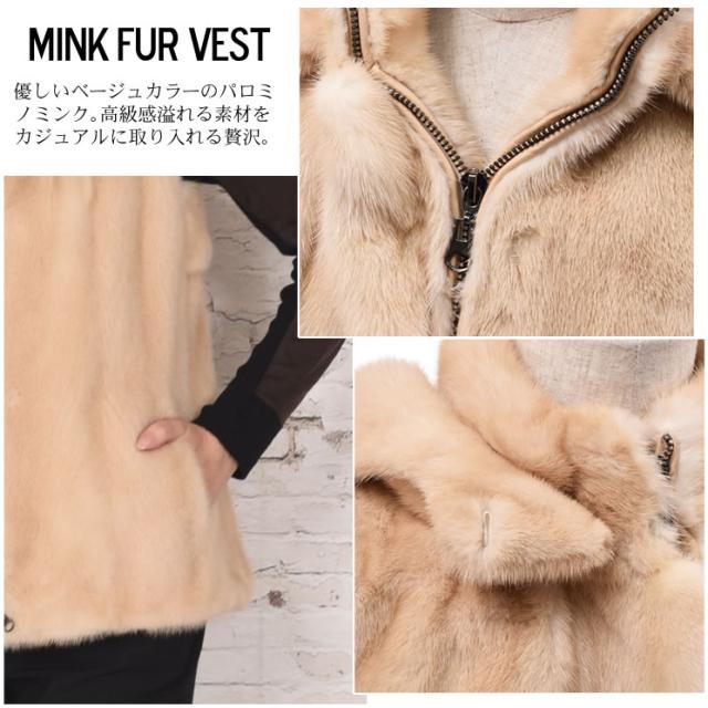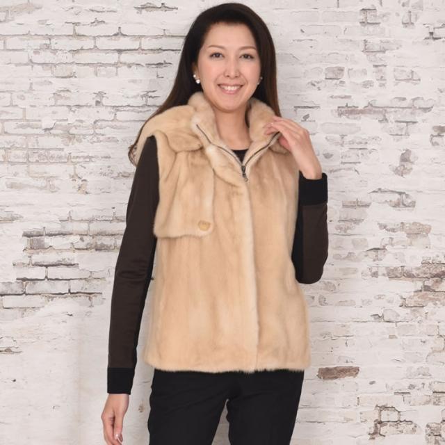 明るく優しい色味のパルミノミンクを使用したベスト。 胸のフラップが粋なアクセント。大人かっこいいデザインですっきりと着映えします。 上質のミンクファーをさりげなく身に着けて大人ならではの着こなしを楽しめます。 女性らしい優しさと輝きを感じる上品なベストです。