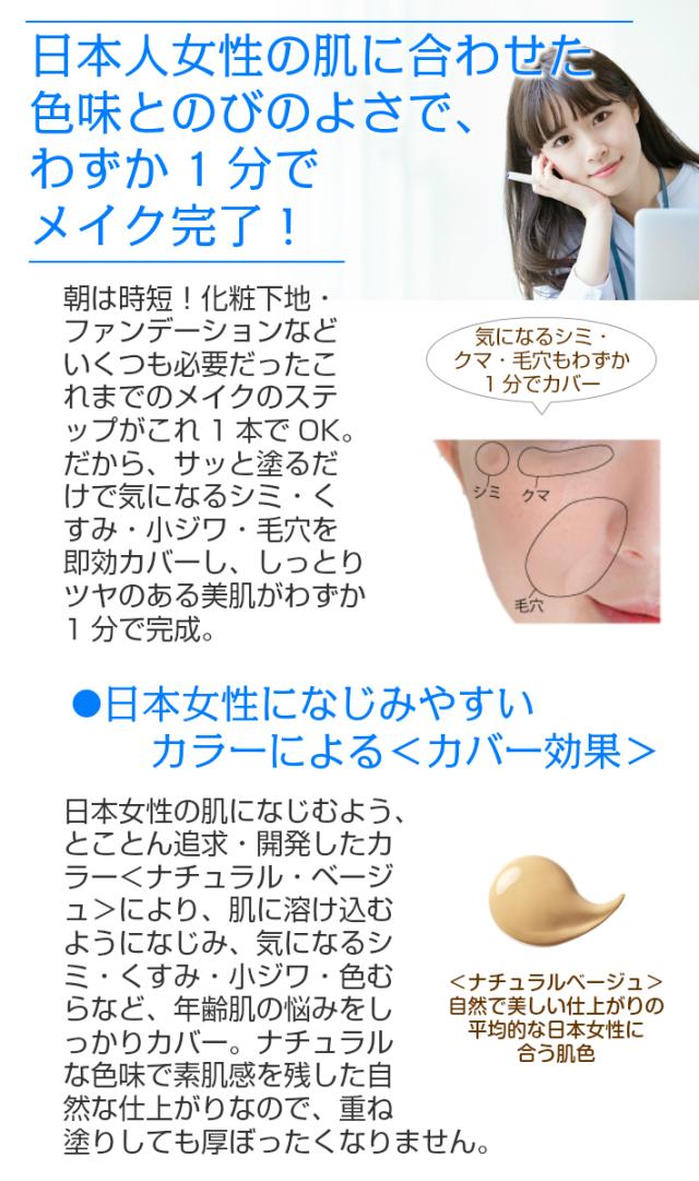 「有効成分」プラセンタエキス(1)、グリチルレチン酸ステアリル「その他の成分」精製水、メチルポリシロキサン、微粒子酸化チタン、デカメチルシクロペンタシロキサン、1,3−ブチレングリコール、酸化亜鉛、ポリオキシエチレン・メチルポリシロキサン共重合体、トリメチルシロキシケイ酸、メチルフェニルポリシロキサン、水酸化アルミニウム、イソステアリン酸、L−システイン、(2S,3R)−2−オクタデカノイルアミノオクタデカン−1,3−ジオール、N−ステアロイルフィトスフィンゴシン、ヒドロキシステアリルフィトスフィンゴシン、イソステアリン酸フィトステリル、5’−イノシン酸二ナトリウム、5’−グアニル酸二ナトリウム、L−チロシン、L−アルギニン、L−プロリン、L−フェニルアラニン、アラントイン、L−イソロイシン、DL−アラニン、L−アスパラギン酸ナトリウム、L−スレオニン、L−バリン、L−セリン、L−ヒスチジン塩酸塩、L−ロイシン、グリシン、L−グルタミン酸、塩酸リジン、タウリン、アセチル化ヒアルロン酸ナトリウム、濃グリセリン、トレハロース液、カッコンエキス、アロエエキス(2)、クロレラエキス、ヒアルロン酸ナトリウム液、加水分解ヒアルロン酸、ダイズエキス、加水分解コラーゲン(4)、水溶性コラーゲン液、ローヤルゼリーエキス、トリベヘン酸グリセリル、PEG−9 ポリジメチルシロキシエチル ジメチコン、ペンタステアリン酸デカグリセリル、ステアロイル乳酸ナトリウム、ナイロン末、セリサイト、メチルハイドロジェンポリシロキサン、酸化アルミニウム、ベヘニルアルコール、メチルシロキサン網状重合体、ポリアクリル酸アルキル、塩化ナトリウム、フェノキシエタノール、酸化チタン、黄酸化鉄、ベンガラ、黒酸化鉄