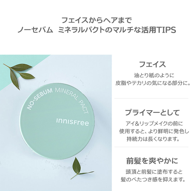 | 成分 | テルク、マイカ、シリカ、緑茶抽出物、ミネラルソルト、ペパーミントの葉エキス、ツバキ葉エキス、みかんの皮エキス |