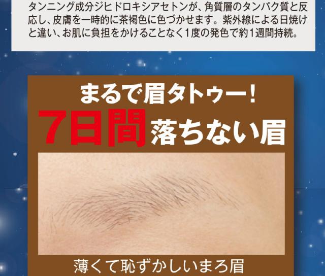 | ご使用方法 | (1)必ず洗顔後、化粧水や乳液などをつける前の素肌に描いてください。 (2)アイブロウがしっかりと乾いたことを確認後、通常のスキンケアを行ってそのまま一晩おやすみ下さい。 (3)朝、アイブロウを落としていただくとセルフタンニング成分による発色したラインができております。 このラインは約1週間程度(個人差あり)、発色をキープしメイク落としや汗・水などで落ちることはありません。 ※はじめてご使用いただく際は発色が弱いことがありますので、朝と夜1日2回のご使用を3日程度続けて下さい。 ※2〜3回重ね描きしていただくと濃く染まります。 ※発色後も毎日ご使用いただくとカラーをキープすることができます。 ※通常のアイブロウとして日中にご使用いただくとより強くカラーをキープできます。 |