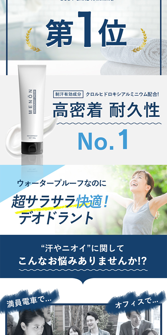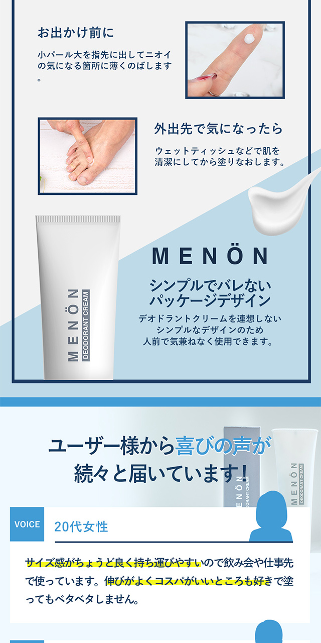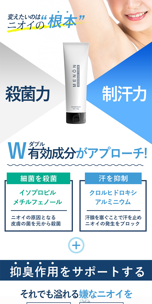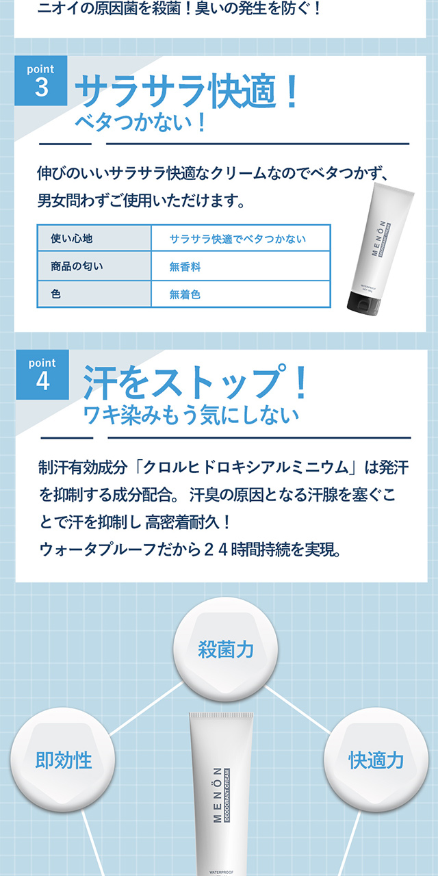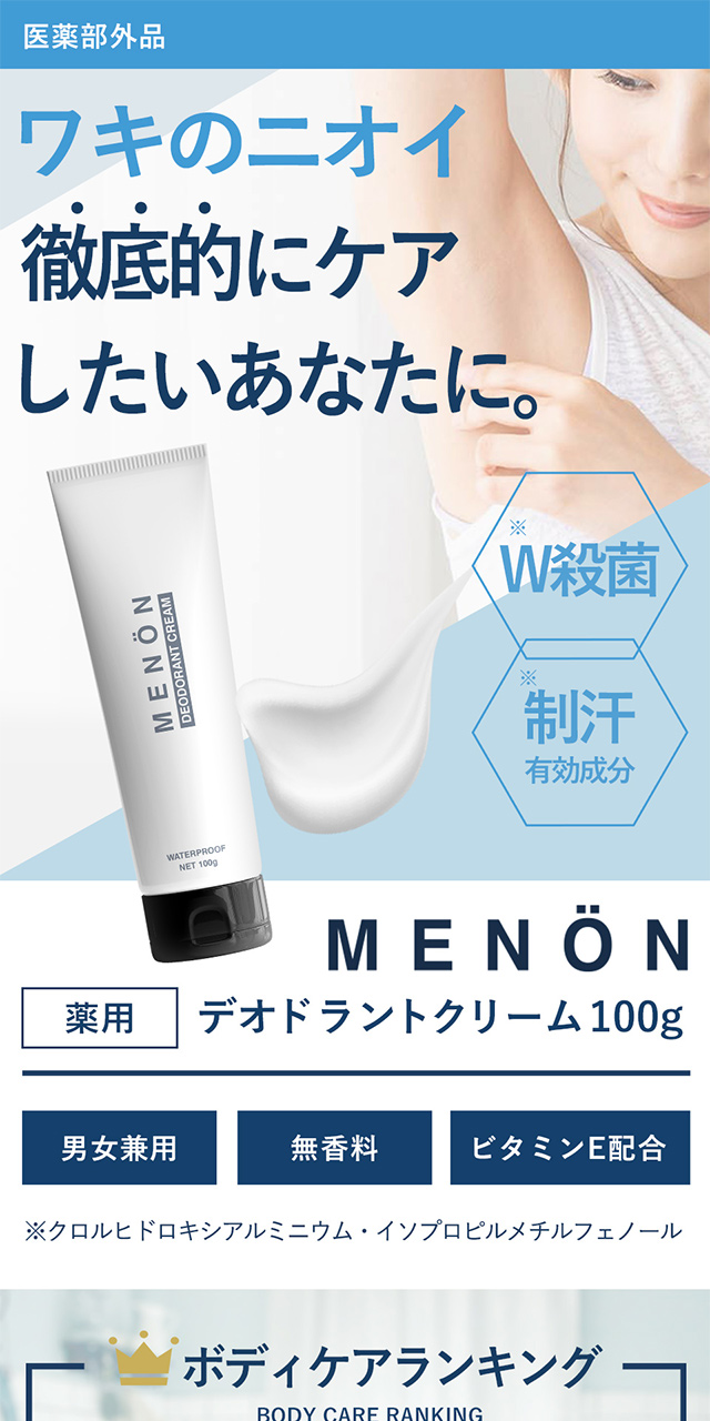 | 商品特徴 | ワキガ・体臭・足の臭い・汗臭にお悩みの男性に、MENONよりWの有効成分配合の薬用デオドラントクリーム[医薬部外品]登場!長時間消臭効果が持続します。 |