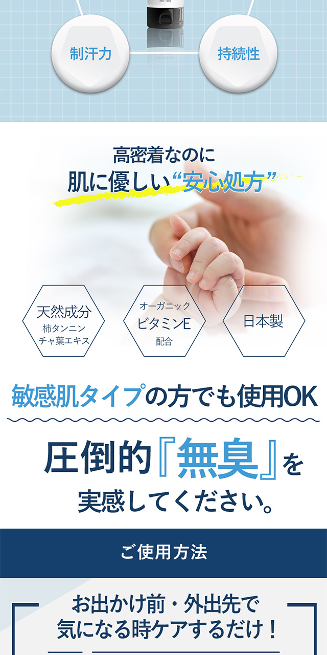 | 成分 | 「有効成分」クロルヒドロキシアルミニウム、イソプロピルメチルフェノール 「その他の成分」水、ジイソステアリン酸ポリグリセリル、イソノナン酸イソノニル、lーメントール、ポリ(オキシエチレン・オキシプロピレン)メチルポリシロキサン共重合体、デカメチルシクロペンタシロキサン、メチルポリシロキサン、メチルフェニルポリシロキサン、ポリアクリル酸アルキル、1,3ーブチレングリコール、濃グリセリン、天然ビタミンE、エデト酸二ナトリウム、フェノキシエタノール、パラベン |
