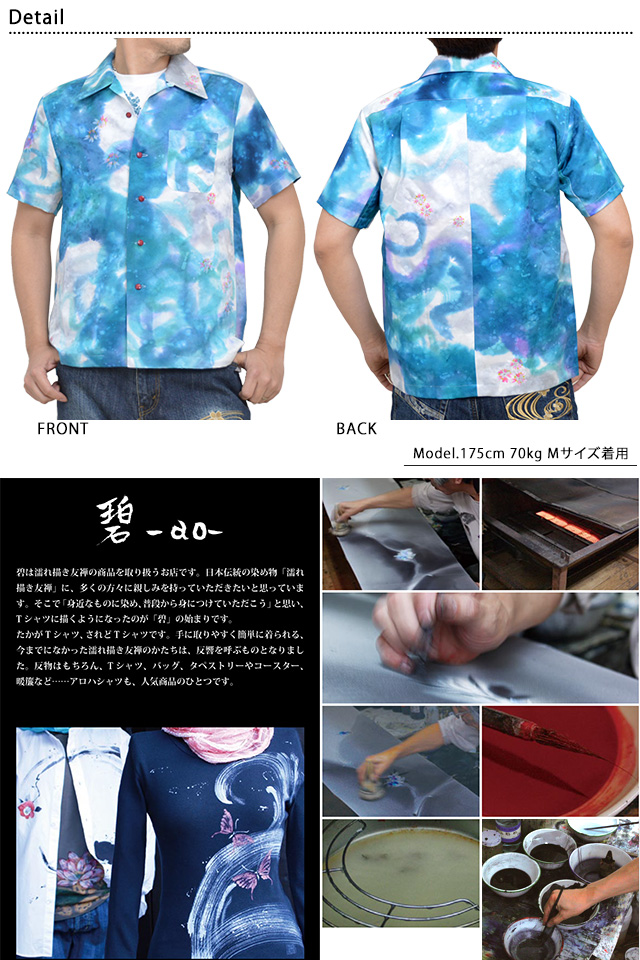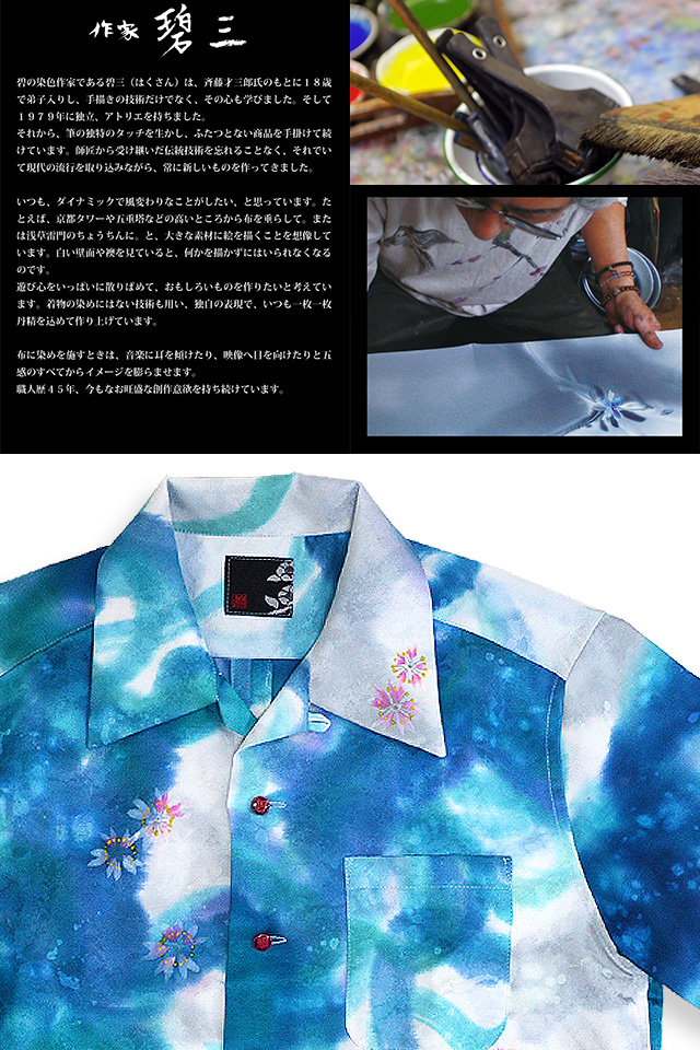 この道40年以上の「ぬれ描き友禅作家・碧三」が魅せる上品で繊細さが特徴の碧(あお)より、手描きシルクジャガードアロハシャツ「さくら」のご紹介です。 当店だけの特別限定モデルのプレミアムアロハシャツが登場。 今回の特徴はなんといっても、地模様が桜で織られているジャガードの正絹を贅沢に使用。 酸性染料で染めており、機械では表現できない。ハンドメイドの温もりを感じさせてくれます。 フロント左胸にはポケットが縫い付けられています。 今回は限定10枚のみの完全受注生産品となります。 納期はご注文を頂いてから、約1か月でお届け致します。 | |||||||||||||||