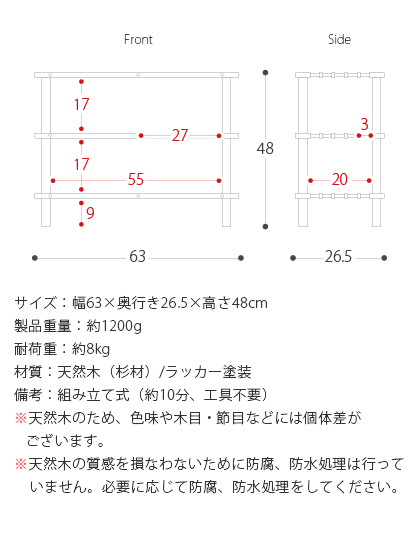 - 棚板は写真で見るよりも細くて頼りないです。 木が割れてしまっている箇所もありました。 縦の柱の部分がネジ式なので、工具を使わずに組み立てられたのは良かったですが、ネジも曲がって取り付けられていて、小学生の工作レベルです。 金額からするとこんなものなのかもしれませんが、あらゆるところがささくれだらけのザラザラ。ヤスリをかけないと危険です。 自然の風合いを残している、みたいな説明がありますが、最低限、安全に使える程度の仕上げはすべきではないですか?