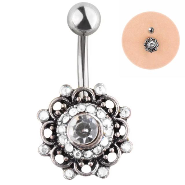 [ヘソピアス ボディピアス 14G ] アメノホヒ へそピアス 14ゲージ 花 フラワー クリスタル ラインストーン ボヘミアン インディアンジュエリー メンズ レディース サージカルステンレス316L 臍ピアス ボディーピアス ヘソピ ジルコニア アンティークシルバー