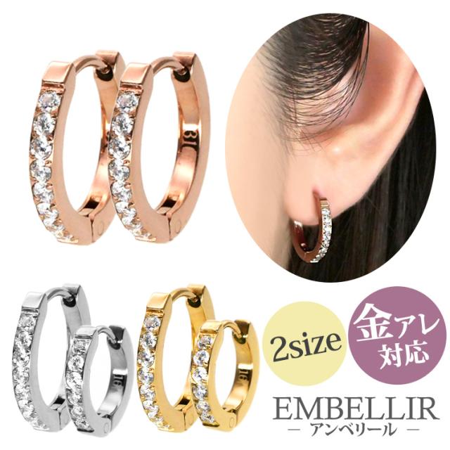 金アレ対応 [EMBELLIR] ステンレスピアス ハーフエタニティステンレスフープピアス フープピアス 両耳用 キュービックジルコニア サージカルステンレス