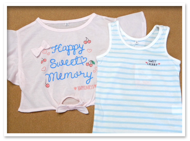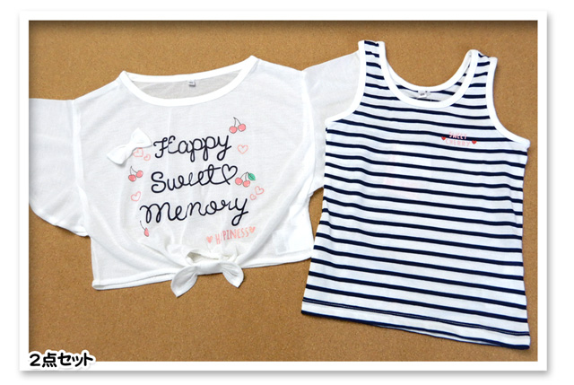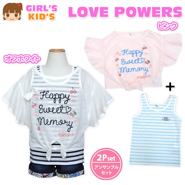 [特長]・LOVE POWERS(ラブパワーズ)・アンサンブル/コンポ・ネームタグ付き[アウター]・半袖Tシャツ ・梨地・ドルマン/ゆったりシルエット・フレア袖 ・リボン装飾・ロゴプリント ・ラメプリント・透け感あり[インナー]・タンクトップ・ボーダー柄 ・ロゴプリント・子供用 ・女の子