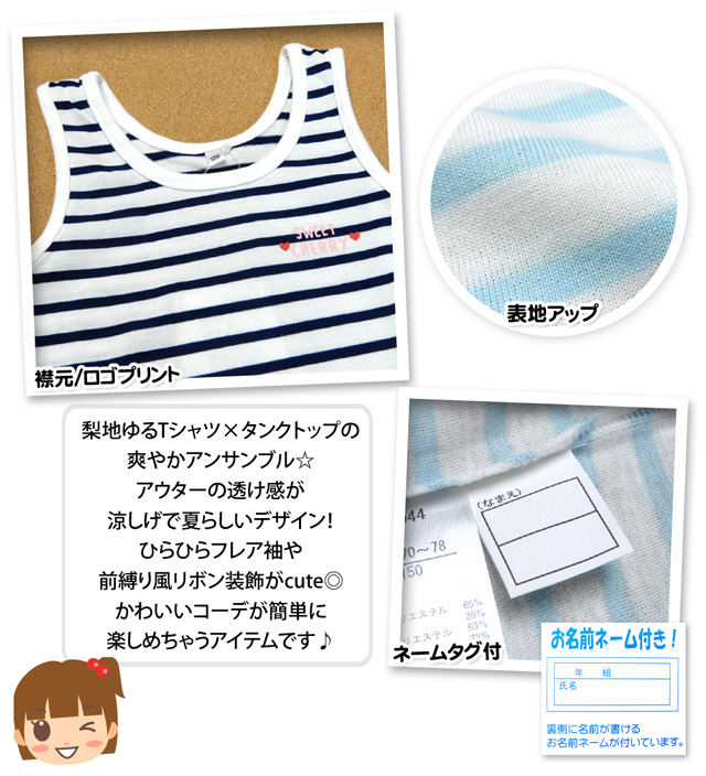 [コメント]梨地ゆるTシャツ×タンクトップの爽やかアンサンブル☆アウターの透け感が涼しげで夏らしいデザイン!ひらひらフレア袖や前縛り風リボン装飾がcute◎かわいいコーデが簡単に楽しめちゃうアイテムです♪