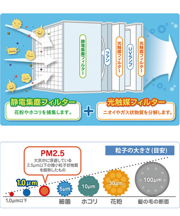 静電集塵フィルター+光触媒フィルターの空気清浄機です。フィルターは丸洗い可能。※細菌を強運転時60分で76%以上低減。