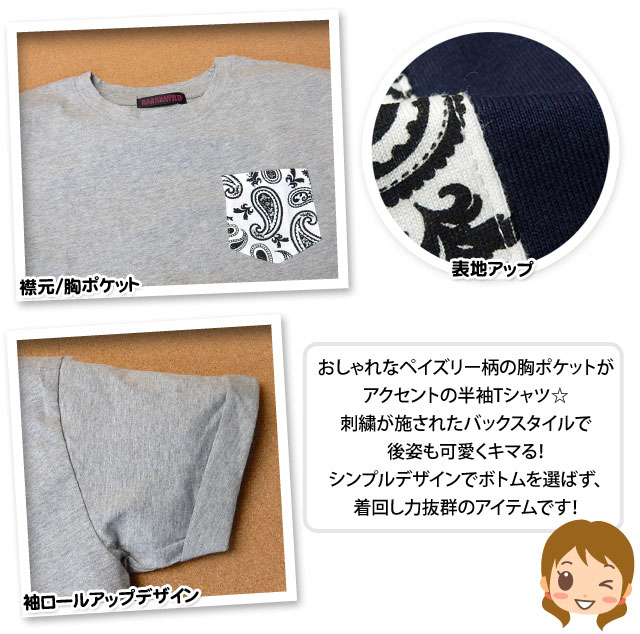 [コメント]おしゃれなペイズリー柄の胸ポケットがアクセントの半袖Tシャツ☆刺繍が施されたバックスタイルで後姿も可愛くキマる!シンプルデザインでボトムを選ばず、着回し力抜群のアイテムです!