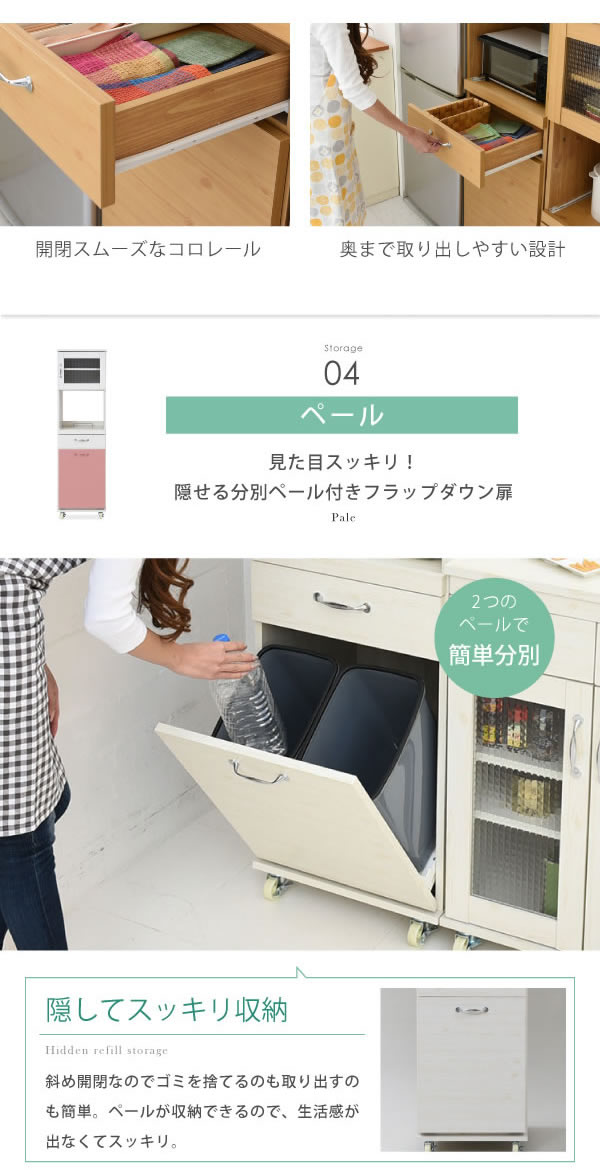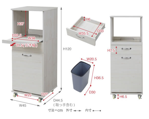 | 本体サイズ | [外寸]幅45×奥行44.5×高さ120cm [内寸] (スライド部)幅38×奥行33.5×高さ3 7cm (スライド引き幅)21.5cm(引き出し)幅35×奥行33×高さ6(有効7.5)cm (ペール)幅20.5×奥行30×高さ36.5cm |