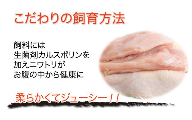 飼料には生菌カルスポリンを加え、ニワトリがお腹の中から健康に。脂肪を減少し、旨みを引き出したワンランク上のチキンです。
