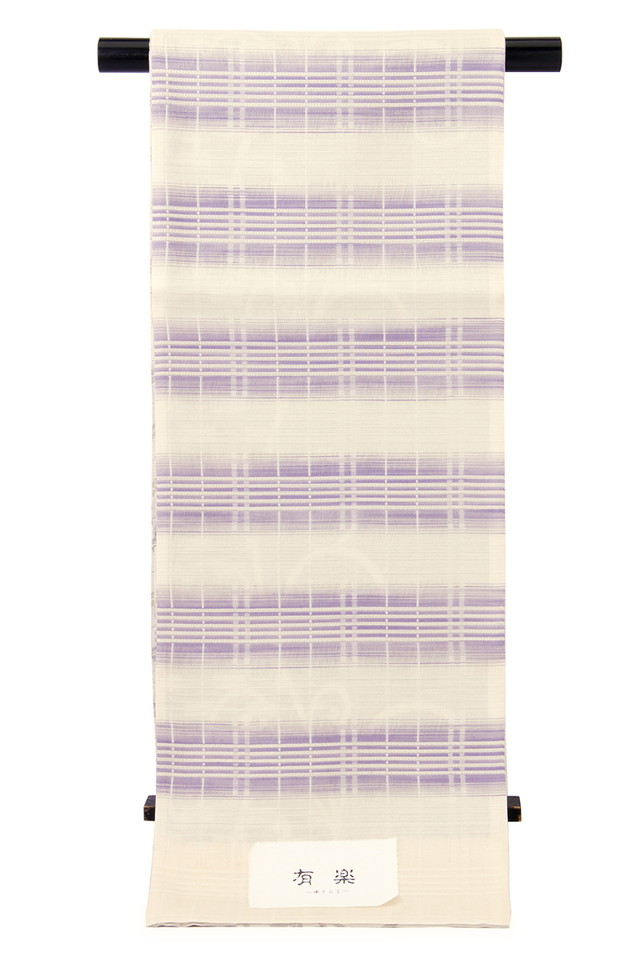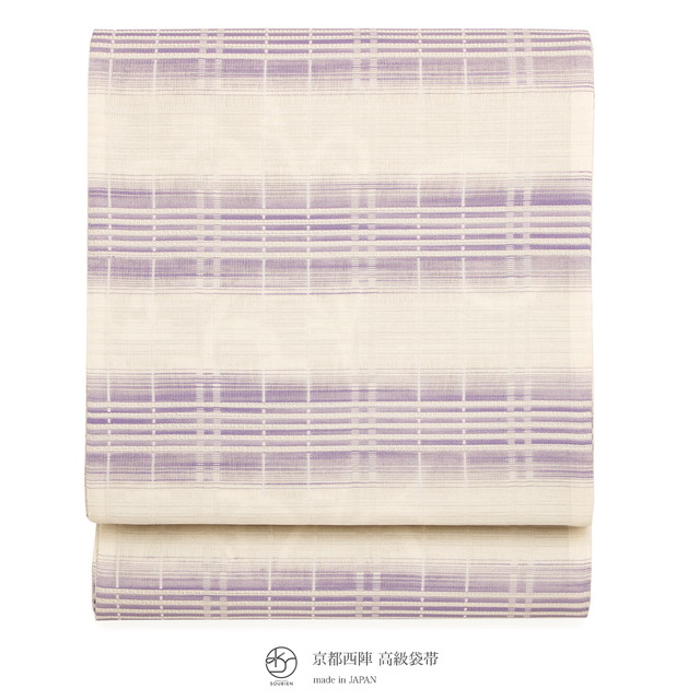 【未仕立て】袋帯 弥栄織物 生成り色 アイボリー 薄紫色 縞 格子 正絹 京都西陣織 有楽 279 六通柄 夏向き 単衣向き 軽め フォーマル カジュアル 日本製