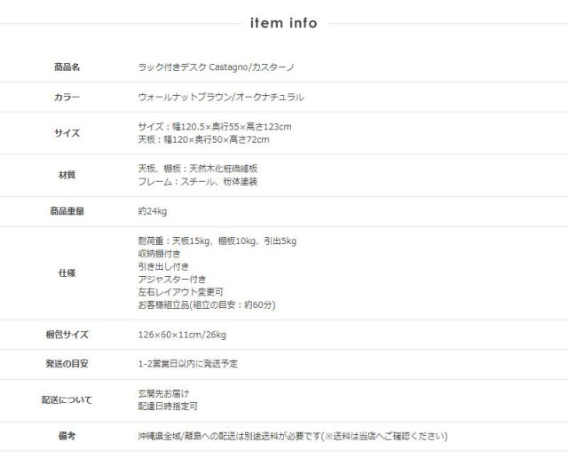 | デザインと機能性を融合したお洒落なラック付きデスク! 他社にないデザインの追求、そして使い勝手にこだわり作り上げたラック付きデスク「カスターノ」。 板材は全て高級感のある天然木突板、フレームは手触りに味のあるサンド塗装の異素材ミックスで、これまでにないオシャレなSOHOスタイルを演出。 本やファイル、小物、プリンターが収納できる棚付きなのはもちろん、文房具や身の回りの小物が収納できる引き出し付き。 「引き出しがあったらもっと良いのに…」というお客様の声を受け、試行錯誤の末生まれたデザインです。 これまで人気のあった北欧ヴィンテージ風のウォールナットブラウンに加え、優し気でさわやかな印象のオークナチュラルを、令和の時代に新たに追加しました! 事務所用のデスク、自分用の書斎机、お子様の勉強机など、より幅広い層のお客様にご愛用いただきたいと思いを込めたデスクです。 |